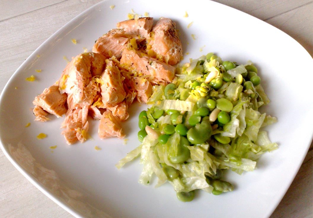 Spacchettate il salmone e fatelo intiepidire. Intanto preparate l’insalata con iceberg, pinoli tostati, fave e piselli e conditela con limone, olio, sale, pepe e prezzemolo.
