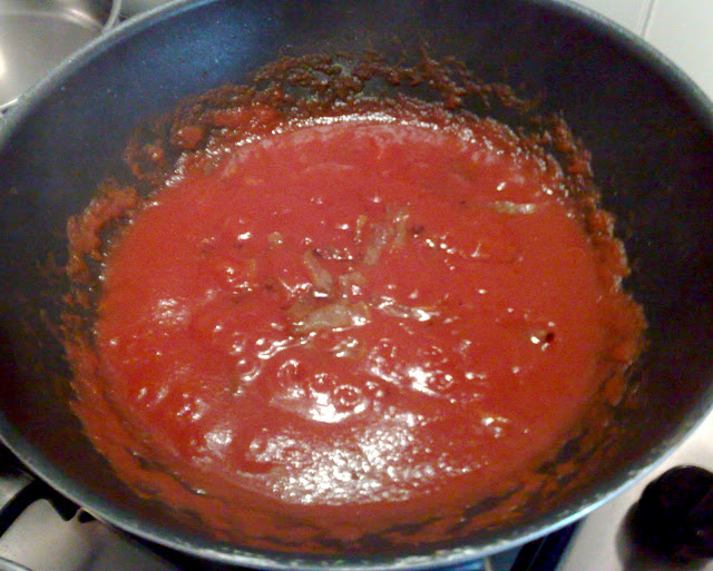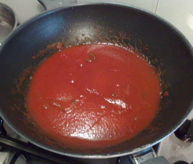 Nella medesima padella versate il sugo di pomodoro fresco (potete usare anche i pelati, io uso la passata perché ho le conserve fatte in casa), e lasciate cuocere a fuoco lento con il coperchio per circa 20 minuti.