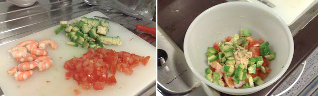 Mettete tutto in una ciotola (pomodoro, avocado, mazzancolle e pinoli) insieme al cucchiaino di salsa cocktail, la salsa worcester, un pizzico di sale e mescolate bene. Se vi piace potete aggiungere anche un pò di peperoncino fresco (tipo jalapeno).