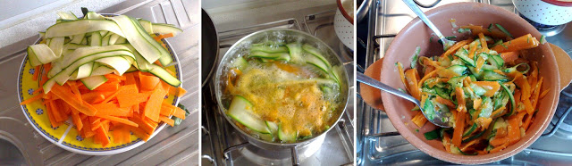 Mondate carote e zucchine e tagliatele a fettine sottile per il verso della lunghezza. Se avete un tagliaverdura o una mandolina farete molta meno fatica 😉