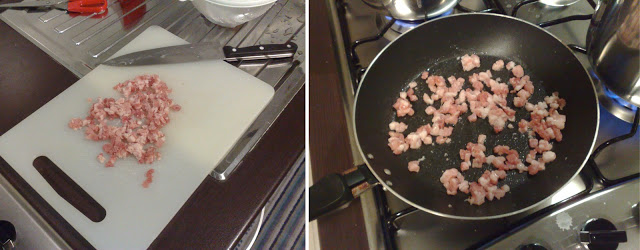 Tagliate la pancetta in pezzetti molto piccoli e fatela rosolare in una padella antiaderente senza aggiungere altri grassi (no olio e no burro).