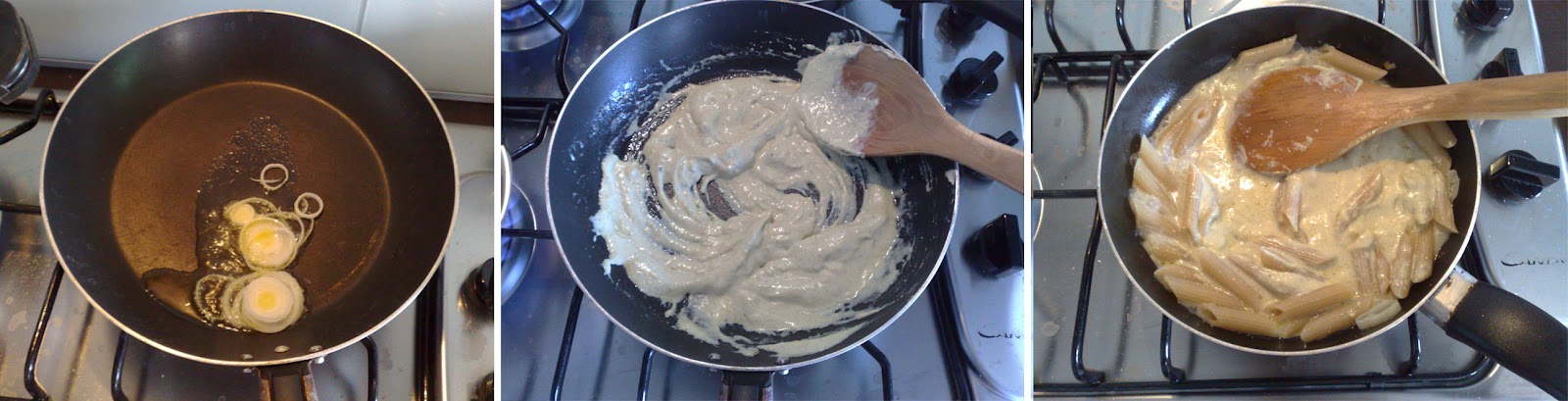 Quando la pasta è quasi pronta, fate scaldare una padella antiaderente con un filo d’olio. Aggiungete il porro e appena inizia ad ammorbidirsi unite la crema (non deve cuocere, deve solo scaldarsi per far saltare la pasta). Scolate la pasta e fatela saltare nella salsa di pistacchi.