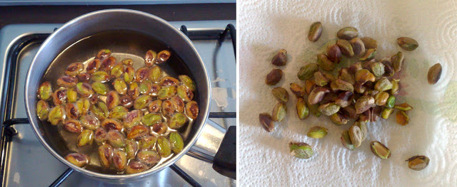 Nel frattempo prendete un pentolino con dell’acqua, portatela a bollore e scottate i pistacchi per 3 minuti circa. Scolateli e sfregateli con della carta da cucina per togliere le pellicine, vedrete che verrà via molto facilmente.