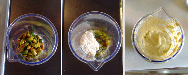 Una volta spellati i pistacchi metteteli nel bicchiere del mixer insieme al parmigiano, il sesamo, 2 cucchiai d’olio, 2 cucchiai di acqua e frullate tutto. Se la crema vi sembra troppo densa, aggiustate con un pò d’acqua fino al raggiungimento della consistenza da voi preferita (io la faccio morbida, simile alla densità del pesto).