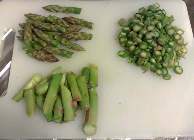 Per prima cosa puliamo gli asparagi eliminando la parte terminale, quella più biancastra.