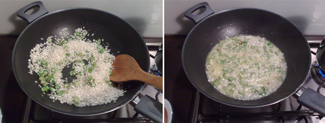 Torniamo alla casseruola. Versiamo il riso insieme alle rondelle di asparagi e facciamolo tostare per un paio di minuti mescolando continuamente. Sfumate con il vino bianco e non appena sarà evaporato iniziate ad aggiungere 1 mestolo o due di brodo. Quando il riso l’avrà assorbito procedete con altre mescolate e così via fino a fine cottura.