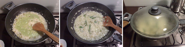 Fateli cuocere per 10 minuti ed estraeteli dalla pentola delicatamente con una schiumarola, in modo da tenere il brodo che useremo per la cottura del riso. In una casseruola o pentola antiaderente mettete un filo d’olio e lo scalogno tritato. Non appena inizia ad imbiondire aggiungete gli asparagi tagliati a rondelle e fate cuocere per 5 minuti con un coperchio.
