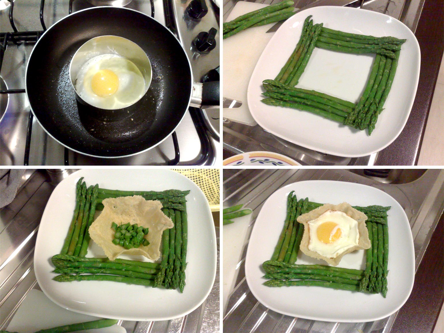 Accostamento classico quello degli asparagi con le uova, io lo mangio fin da quando sono piccola, rigorosamente con burro fuso e parmigiano. Ho voluto reinterpretare l’ingrediente “parmigiano” trasformandolo in un cestino che contiene l’uovo, così quando il tuorlo si rompe rimane contenuto nella cialda.