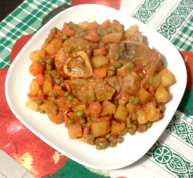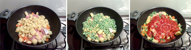 Appena il vino sarà evaporato aggiungete le patate, i piselli e la salsa di pomodoro.