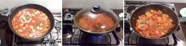 Aggiungete l’acqua calda fino a coprire il contenuto della padella e fate cuocere a fuoco lento con il coperchio per 1 ora e 30 minuti circa, mescolando di tanto in tanto.