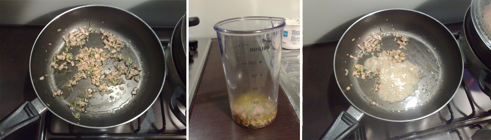 Il salmone si cuoce velocemente, ci vorranno 5 minuti circa. Spegnete il fuoco, aggiungete il prezzemolo, sale e pepe. Prendete metà del condimento, frullatelo con 2 cucchiai di latte e rimettetelo nella padella.