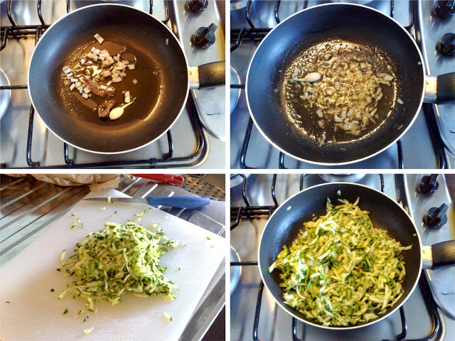 Grattugiate la zucchina con la grattugia a fori larghi e unitela al soffritto. Fatela saltare per 5 minuti circa mescolando bene per farla insaporire e amalgamare con gli altri ingredienti. (In questo caso metto pochissimo sale perché l’acciuga è molto saporita).