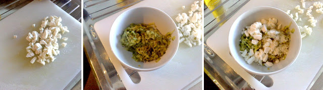 Tagliate a pezzettini la mozzarella, trasferitene metà in una ciotolina e mescolatela con il composto di zucchine, un pò di pepe nero macinato e un cucchiaio di pecorino grattugiato.