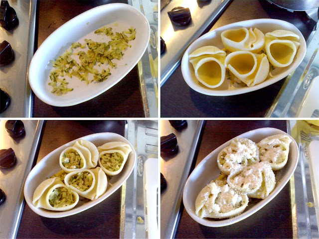 Mettete un cucchiaio di farcia sul fondo di una pirofila. Adagiatevi sopra le conchiglie e riempitele con il composto di zucchine. Terminate con la restante mozzarella e pecorino e infornate a 180° per 10 minuti.