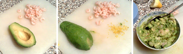 Grattugiate la scorza di limone e mettetela in una ciotola insieme all’avocado, il succo di mezzo limone, sale e pepe e mescolate energicamente con la forchetta fino a creare un composto abbastanza cremoso. Non frullatelo, devono rimanere dei pezzetti di avocado all’interno. Unite i gamberetti tenendone da parte qualcuno per la decorazione.