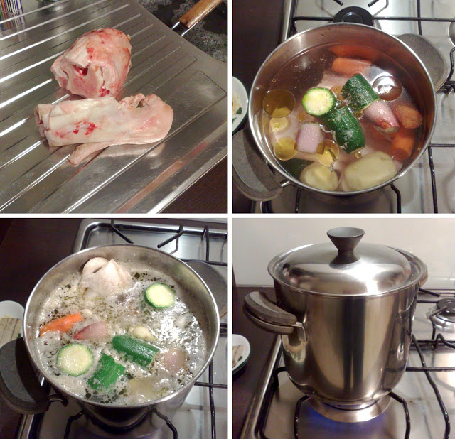 Riempite d’acqua una pentola capiente della quale avete il coperchio e unite tutte le verdure mondate, l’osso, 1 cucchiaio scarso di sale grosso, 2 cucchiai d’olio extravergine d’oliva e pepe nero macinato.