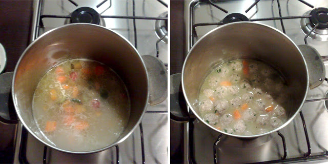 Versate 100 gr di pastina (il formato che volete, basta che la cottura sia almeno di 8 minuti) nel brodo bollente, mescolate e poi iniziate ad immergere delicatamente anche le polpettine.