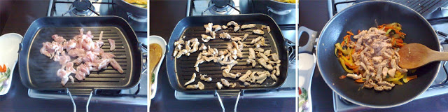 Completata la marinatura del pollo eliminate la parte liquida, disossate i fusi e tagliate tutta la carne a listarelle.
