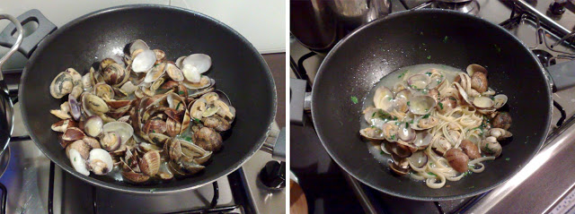 (Nella mia foto vedrete che di colpo le vongole si dimezzano e la pasta è per una persona sola…tranquilli, non sono impazzita. Siccome il mio compagno è ciliaco devo condire la pasta separatamente, prima la sua e poi la mia, per evitare contaminazioni da glutine.)