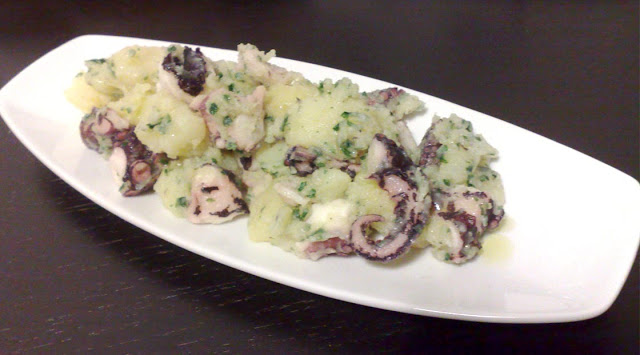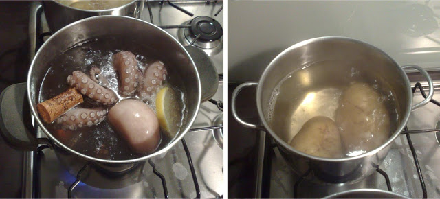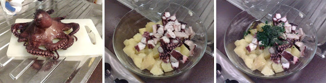 Prendete il polipo, tagliatelo a pezzetti (io uso direttamente le forbici, sono più comode) e mettetelo in un’insalatiera. Aggiungete le patate tagliate a cubetti, il prezzemolo, il succo di limone, l’aglio tagliato a metà e privato del germoglio interno, abbondante olio evo (di quello buono), sale e pepe secondo il vostro gusto.