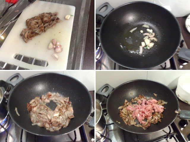 Tagliate l’aglio a metà e privatelo del germoglio interno, affettate lo scalogno e i funghi e mettete il tutto in una padella antiaderente con un filo d’olio e fate rosolare a fiamma vivace per 10 minuti. Se avete il wok è l’ideale.