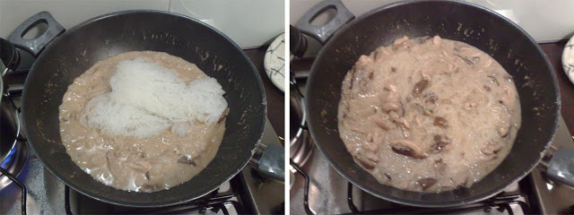 Intanto immergete i noodles di riso nel brodo di pollo bollente per 5 minuti scarsi (a fuoco spento, non devono cuocere, devono solo rimanere a bagno nel liquido caldo), scolateli, versateli nel wok e aggiustate di sale e pepe.
