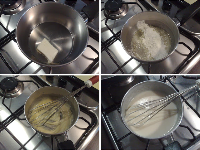 Prendete un pentolino e fate sciogliere il burro senza che inizi a friggere. Aggiungete la farina e mescolate fino ad ottenere una crema densa e senza grumi. Aggiungete il latte a filo senza mai smettere di mescolare, il sale e la noce moscata. Fate cuocere, sempre mescolando, fino a che la besciamella non diventerà una crema densa e vellutata (circa 10 minuti).