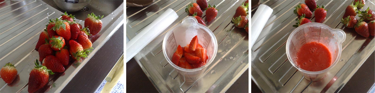 Intanto lavate e tagliate il resto delle fragole, mettetele nel bicchiere del mixer e frullatele insieme allo zucchero o al miele.