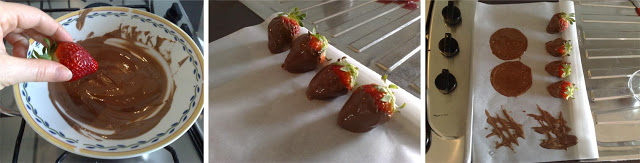 Lavate le fragole, scegliete le 4 più belle e immergetele per metà nel cioccolato fuso.