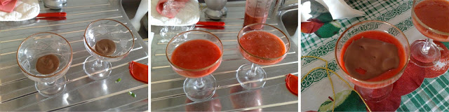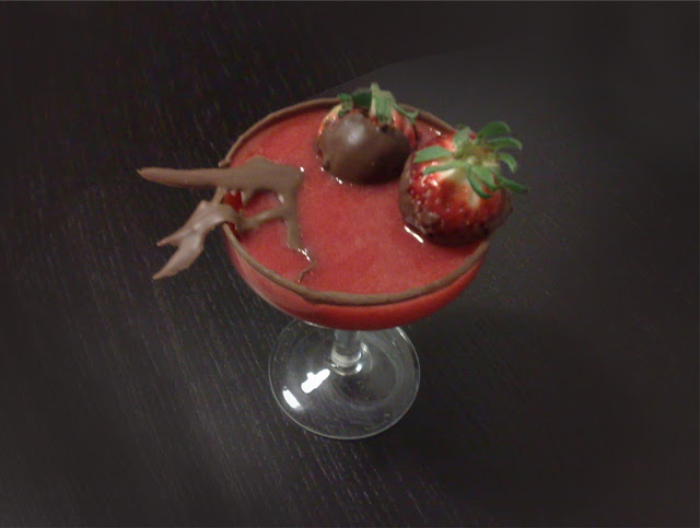 Prendete ora delle coppette o dei bicchieri da cocktail, immergete il bordo nel cioccolato, capovolgeteli e mettete sul fondo ciò che è avanzato del cioccolato fuso e coprite con un pò di frullato di fragola. Tirate fuori dal frigo gli altri elementi, staccate delicatamente i cerchi di cioccolato dalla carta da forno e posizionateli nei bicchieri con la mousse, coprite con il restante fullato di fragole e terminate decorando con i “ghirigori” e le fragole ricoperte di cioccolato.