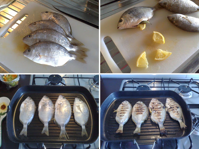 Spargete la piastra con del sale grosso e cuocete i saraghi per 5-7 minuti per lato.