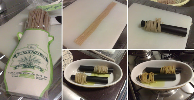 Prendete circa 6 tagliatelle alla volta e posizionatele su un tagliere, pareggiate le estremità tagliandole con un coltello e arrotolatele su dei supporti cilindrici che possano andare in forno. Io ho usato i coni che servono per fare i cannoncini, ma se non li avete potete tranquillamente fare dei “salsicciotti” di carta stagnola e arrotolarci intorno la pasta.