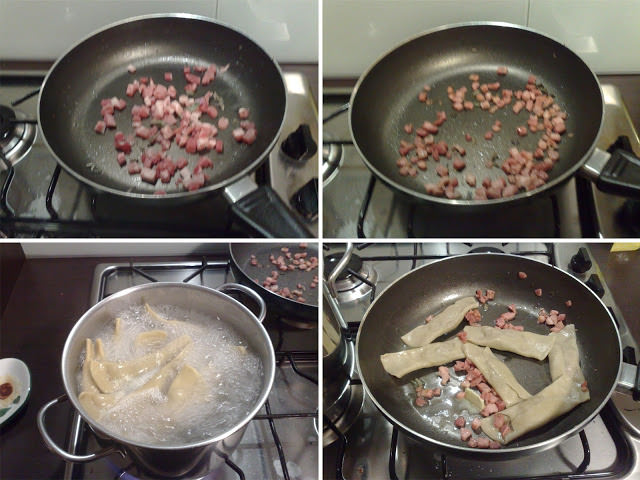 Portate a ebollizione abbondante acqua salata e cuocete i casoncelli per 4/5 minuti, fate rosolare la pancetta insieme al burro e alla salvia.