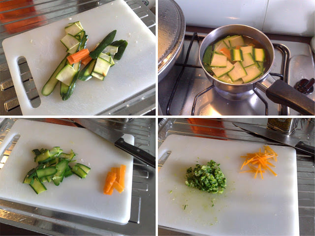 Per prima cosa mondate le verdure e affettatele a “nastro” con l’aiuto di una mandolina.