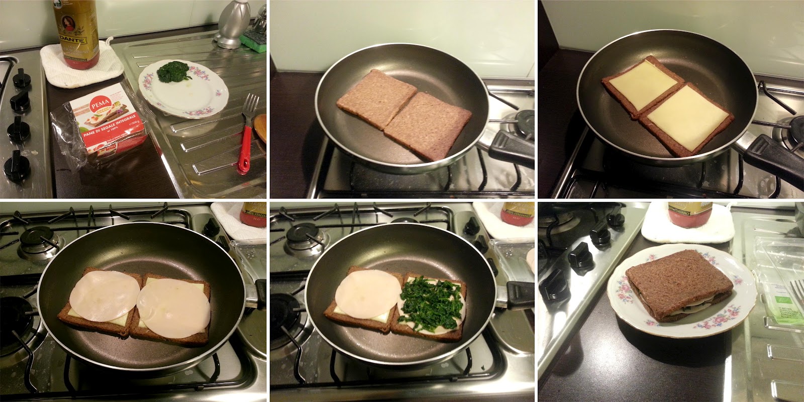 Spegnete il fuoco e aggiungete anche il tacchino, gli spinaci, un pizzico di sale e chiudete il tramezzino sovrapponendo le due parti.