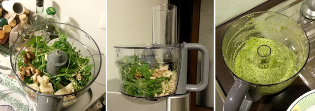 Lavate bene la rucola, tagliate grossolanamente il formaggio e mettete tutti gli ingredienti (esclusa la pasta ovviamente) nel robot da cucina. Frullate il tutto fino ad ottenimento di una crema. Potete eventualmente regolarne la densità aggiungendo olio (o acqua se non volete rincarare la dose di calorie).