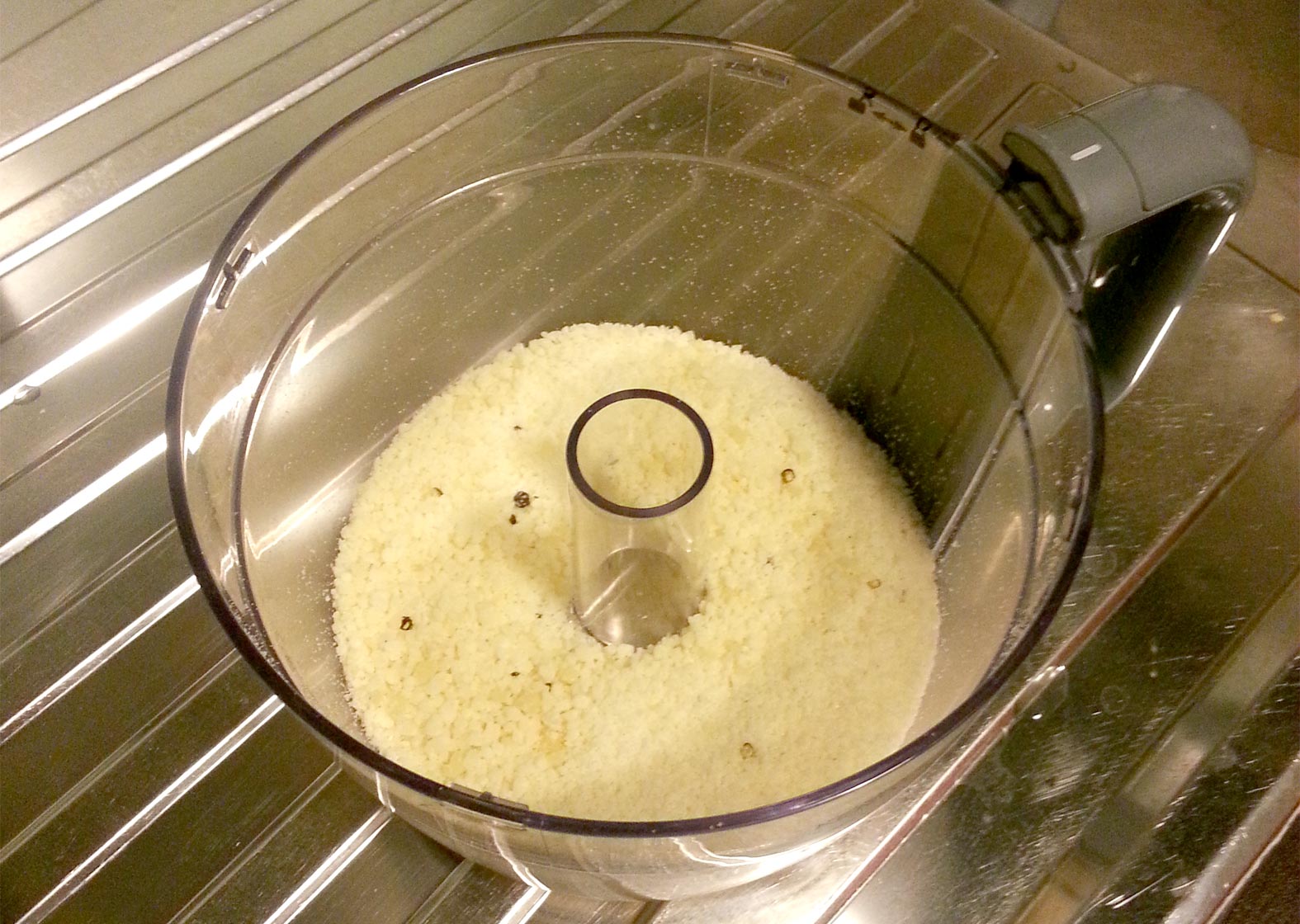 Per velocizzare le operazioni, mettete i 2 formaggi nel robot da cucina insieme ai grani di pepe e azionatelo fino ad ottenere un grattugiato fine ben amalgamato.