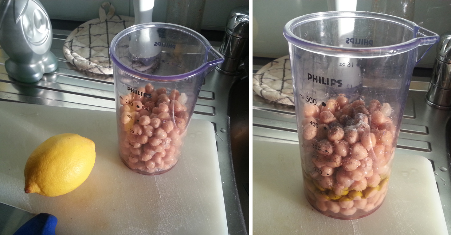 Mettete i ceci nel bicchiere del mixer, aggiungete il succo di un limone, sale, pepe nero macinato e 1 cucchiaio d’olio extravergine d’oliva e frullate il tutto.