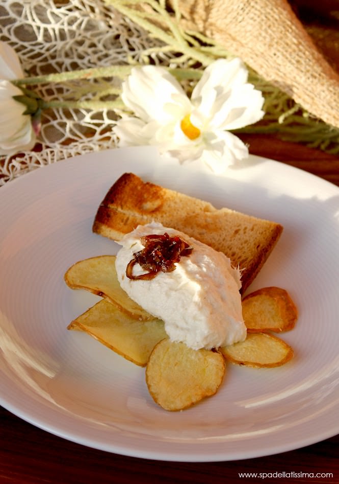 Oggi ve la propongo con l’immancabile latte di cocco, le patate, un bel crostino di pane che non fa mai male e per finire scalogno caramellato all’aceto balsamico.