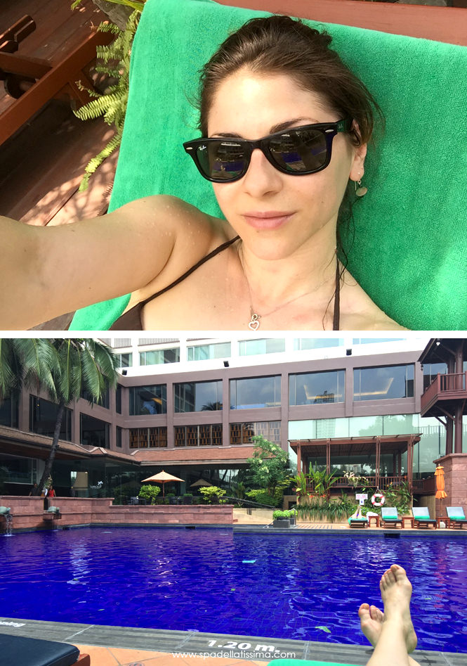 Non avevamo abbastanza tempo dovendo prendere il taxi per l’aeroporto alle 14, quindi ho optato per un paio d’ore di puro relax in piscina. Sole, palme e protezione 50 perché anche se mi metto all’ombra mi ustiono sicuro, sono talmente bianca che rifletto la luce!